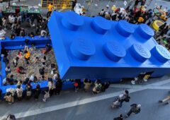 紫色のクレヨンの被るタイプの着ぐるみを身に着け、手にはミニフィグの顔が書かれたプレートを持っています。